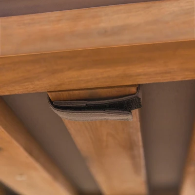 Relax under the warm summer sun in this gorgeous and comfortable outdoor open side chair and ottoman. Featuring soft cushions and durable yet stylish acacia wood, this is truly a winning combination. The angular design of both the chair and ottoman create a modern and contemporary style with classic and traditional elements, ideal for your patio.