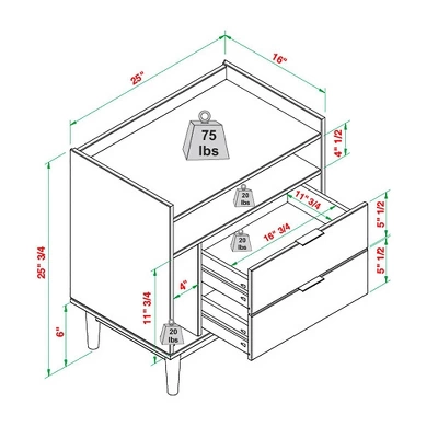 - Weight capacities: Top surface 75 lbs., cubbies and drawers 20 lbs. each